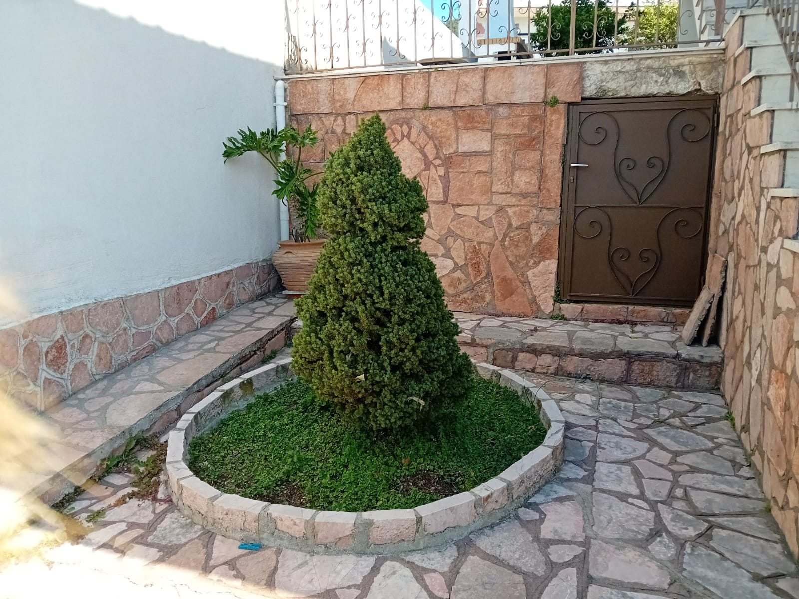 Η αυλή της κατοικίας είναι όμορφα διαμορφωμένη με πέτρα και διαθέτει διάφορων ειδών λουλούδια και δέντρα.